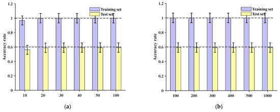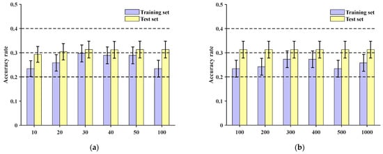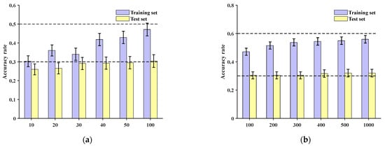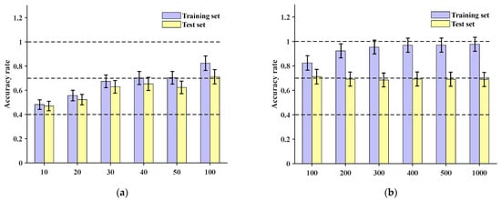 Comparing the method presented in this paper with the MC-CNN model (multi-channel convolutional neural network), the original dataset was input into the MC-CNN [29]. The data underwent a series of operations such as convolution and pooling to automatically extract features. Training was conducted for 10, 20, 30, 40, 50, and 100 epochs, respectively, and the final accuracies for the training set and test set are shown in Figure 15a, with the maximum accuracy reaching 71.2%. Further increasing the number of training epochs to 200, 300, 400, 500, and 1000, the test set accuracy remained below 70%, as depicted in Figure 15b.