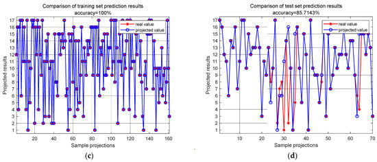 The t-distribution stochastic neighbor embedding (t-SNE) algorithm is a nonlinear dimensionality reduction technique used for visualizing high-dimensional data [32]. To further analyze the effectiveness of the method presented in this paper, t-SNE was employed to perform secondary processing on features extracted from the dataset by the MSFF-CNN model to obtain more important and sensitive feature information. These obtained results are shown in Figure 21. Figure 21a–c represent the two-dimensional feature distribution status of the training set data extracted at the input layer, softmax layer, and output layer of the MSFF-CNN after t-SNE processing. It can be observed that original signals are interwoven at the input, with numerous samples mixed together, making it impossible to distinguish clear classification features, as shown in Figure 21a. The original data, after being input into the MSFF-CNN, undergo feature extraction layer-by-layer. As the depth increases, up to the softmax layer, data from the same category have already gathered together, and different categories are clearly clustered, as shown in Figure 21b. Figure 21c,d represent the two-dimensional feature distribution status of the test set data extracted at the input layer, softmax layer, and output layer of the MSFF-CNN after t-SNE processing. They exhibit similar distribution characteristics to the training set data, indicating that the clustering effects of both the training and test sets are significant, and also directly reflecting a clear classification effect.