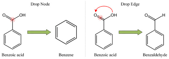 For recommendation systems, the contrastive learning technique [19,20,21] is an effective solution to alleviate the problem of data sparsity. Most contrastive learning-based item recommendation models adopt the principle of InfoMax [20,22,23], which maximizes the consistency between positive pairs and pulls them closer while minimizing the consistency between negative pairs and pushing them away. However, they usually adopt random augmentation strategies (i.e., drop node, drop edge) to obtain two augmented views, which is unable to guarantee that the two augmentations are positively correlated. As shown in Figure 1, benzoic acid is a common food preservative. If we drop a carbon atom from benzoic acid by dropping operation, benzoic acid will turn into benzene. However, benzene is a highly toxic chemical substance with completely different chemical properties compared to those of benzoid acid. In addition, if we break the chemical bond between oxygen and carbon atoms in benzoic acid through dropping edge operation, benzoic acid will transform into benzaldehide. Unlike benzoid acid, benzaldehide is widely utilized in food seasoning. Therefore, adopting random augmentation strategies to obtain augmented views will change the structural information of the original graphs.