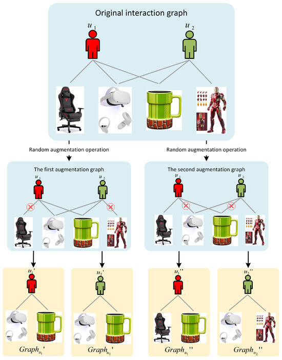 For personalized item recommendation, random augmentation strategies would change the underlying semantics of the original user–item bipartite graph. Moreover, random augmentation strategies may also introduce false negative samples. For instance, assume user has purchased items and user has purchased items . According to the historical records of users and , the original graph is presented in Figure 2. By utilizing dropping edge operation, we can obtain the first augmented view, i.e., and , and the second augmented view, i.e., and . According to the principle of contrastive learning, and should be a positive pair. Meanwhile, and should be a negative pair. However, and share common preferences since they visit the same set of items. Hence, and is a false negative pair. In general, the random augmentation may introduce false negative samples, resulting in the recommendation models unable to accurately distinguish positive and negative pairs.