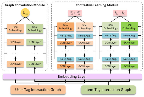 In this section, we introduce the proposed contrastive learning-based personalized tag recommendation model, which is called CLPTR. CLPTR mainly consists of two important components, i.e., a graph convolution module and a contrastive learning module. We utilize the graph convolution module to capture the collaborative signals and inject the collaborative signals into the embeddings of entities. In addition, the contrastive learning module generates augmented views of user–tag and item–tag interaction graphs by injecting noises into implicit feature representations rather than dropping nodes and edges. Moreover, the contrastive learning module utilizes InfoNCE to learn the embeddings of entities by pulling the embeddings of positive pairs close and pushing the embeddings of negative pairs away. The framework of the contrastive learning-based personalized tag recommendation model is illustrated in Figure 3.