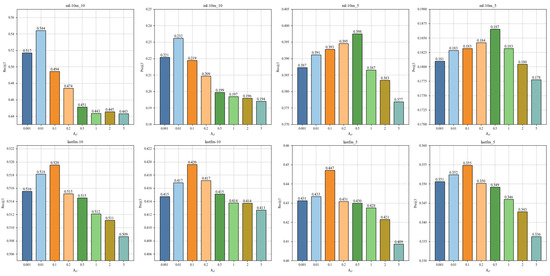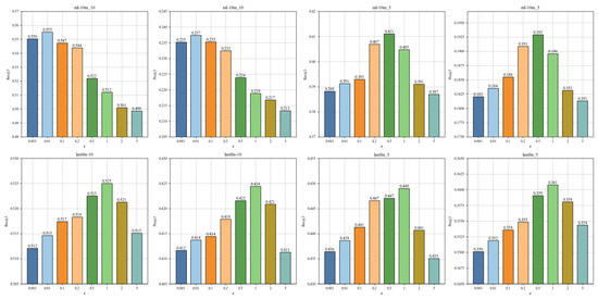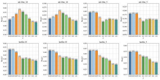 In this section, a group of experiments is conducted to analyze the sensitivity of . Figure 4 plots the performance changes of CLPTR with different values of . As shown in Figure 4, the performance of CLPTR is sensitive to the values of . In addition, when the value of is small, CLPTR shows competitive performance. For example, on ml10m-5 and lastfm-5, CLPTR achieves the best performance when . One possible reason is that the small value of makes CLPTR pay more attention to the differences among entities, and capturing individual differences is beneficial for the performance of CLPTR.