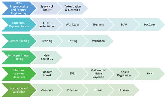 In the case of the random forest classifier, an extra stage was performed to optimize the hyperparameters using Grid Search. The objective of this approach was to enhance the performance of the classifier by identifying the most efficient hyperparameters. After being established, the optimized random forest classifier was trained and evaluated on the testing set. A comprehensive classification report was generated, which provided information on the accuracy, recall, and F1-score. To investigate possible improvements in the performance of the model, different methods of representing features were analyzed. The techniques utilized were TF-IDF, Word2Vec, N-grams, FastText, Doc2Vec, Bag of Words (BoW), and Hashing Vectorizer. The project sought to evaluate the influence of various feature extraction strategies on the overall effectiveness of the models. This methodological framework is thorough and follows a methodical and step-by-step plan. It starts with preparing the data and evaluating the classifier. Then, it moves on to modifying the hyperparameters and finally explores several techniques for representing features. The systematic approach of these processes enhances the rigorous and comprehensive research into the detection of false information within the dataset. Figure 3 represents the architecture diagram of textual data methodology.