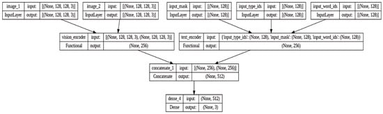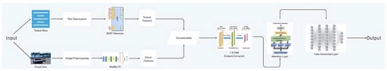The common feature extractor with an attention mechanism presents an enhanced scaled dot-product attention approach that may be used for both textual and visual components. This mechanism facilitates the establishment of linkages between the text and images of a post. It incorporates self-attention on images and bidirectional attention processes on text and visual elements. The matrices , , and are processed using fully connected layers, which incorporate layer normalization and a residual connection. The outcome consists of three vectors: , , and , which represent the combined features. The final step entails compressing the feature vector and passing it through a fully connected layer to obtain . Afterward, a fully connected layer consisting of 32 neural units combines and transmits the outputs and to provide a comprehensive representation of both textual and visual features. This improved design seeks to enhance the extraction and integration of textual and visual information to increase the effectiveness of the model in recognizing disinformation. Figure 5 represents the architecture diagram for the proposed methodology.