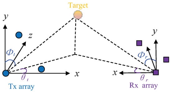 where  and  denote the coordinate vectors of the m-th Tx sensor and the n-th Rx sensor, respectively.  and  are direction cosines corresponding to the Tx array and the Rx array, respectively. In detail, , , , and  are expressed as