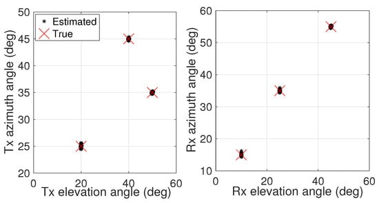 In the first simulation, we illustrate the scatting results of the proposed algorithm, where , , , and the signal-to-noise ratio (SNR) is set to 20 dB. In this simulation, we consider a 3D array geometry for both the Tx array and the Rx array. The entities of the Tx position vector and the Rx position vector are randomly distributed within ranges of  and , respectively. The 2D DOD and 2D DOA are fixed at , , , and , respectively. A graphical depiction, obtained through the application of our innovative algorithm is presented in Figure 2. Evidently, the angle scatter points of the proposed algorithm are tightly clustered around the correct points. This indicates that the proposed method achieves automatic pairing and high-precision 2D DOD and DOA estimation for conformal-array MIMO radar.