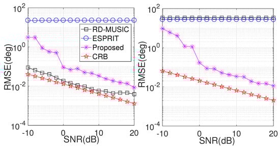 Performance comparison versus SNR. (Left) RMSE comparison in DOD estimation (right) RMSE comparison in DOA estimation.