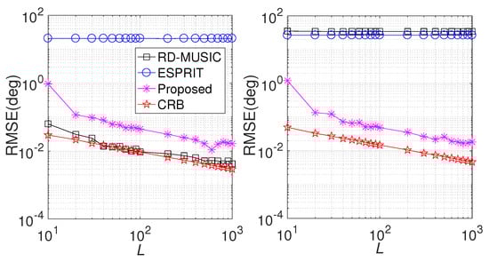 Performance comparison versus L. (Left) RMSE comparison in DOD estimation; (right) RMSE comparison in DOA estimation.