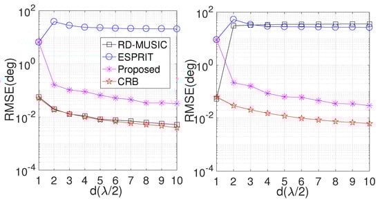 In the forth simulation, we repeat the comparison with different inter-element spacing (d). Similarly, other parameters are fixed as in the second simulation. The results are displayed in Figure 5. An interesting observed phenomenon is that the ESPRIT algorithm offers the same RMSE performance as the proposed algorithm for the ULA configuration (), while RD-MUSIC offers more accurate results than the proposed algorithm in the presence of the ULA configuration. However, when d is larger than , both RD-MUSIC and ESPRIT fail. As expected, the RMSE of the proposed algorithm is improved with the increasing d, as a larger d value is associated with a larger array aperture, yielding more accurate results.