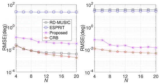 Performance comparison versus N. (Left) RMSE comparison in DOD estimation; (right) RMSE comparison in DOA estimation.