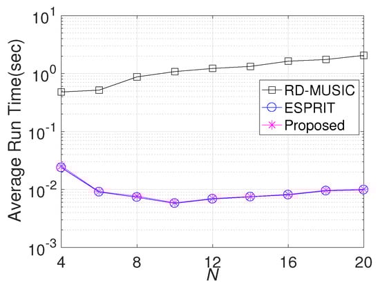 Average running time comparison versus N. Obviously, the proposed algorithm requires only 1–10% of the running time of RD-MUSIC.
