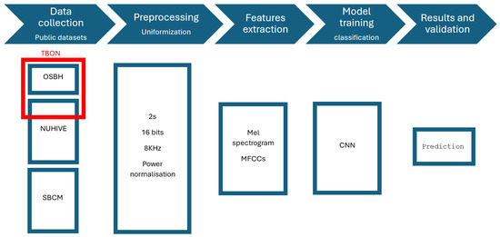In this study, we used only publicly available datasets that were appropriately tagged for learning patterns within beehive environments. The datasets employed in this research were the NUHIVE project [25], OSBH [27], and SBCM [43]. Specifically, the version of the OSBH dataset used was the one processed in TBON. These datasets were combined with data from NUHIVE and SBCM. This process required data preprocessing steps to facilitate integrated use in pattern recognition tasks.