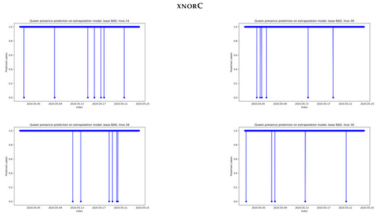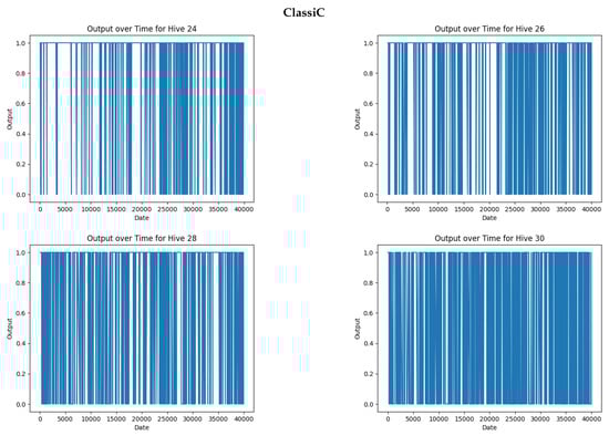 Nolasco and Terenzi worked on the NUHIVE dataset [25], which is only composed of two hives labeled with Queen–NoQueen. In their article, they studied several features and classification models, and they isolated one hive during the learning phase to test extrapolation. While the obtained models were accurate with respect to the hives used for training, none of the models extrapolated properly to the other hives in the dataset. Orlowska worked on the TBON database [26], which is composed of the NUHIVE [25] and OSBH [27] databases, which constitute 65% and 55%, respectively. The results are similar, i.e., the models do not generalize to unseen hives.