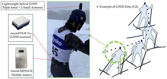 This picture and image show the experimental setup. The GNSS antenna was attached to the skier’s head, and the receiver and mobile router were stored in a small bag at the skier’s waist. This setup obtained head positioning data (latitude, longitude, altitude, and VOG) during the timed race.