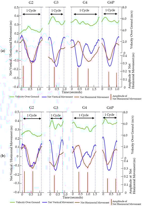 The figure shows the typical waveform patterns of subject A (a) and subject B (b) for G2, G3, G4, and G6P. The black dashed lines indicate the points where the net vertical head movement reaches a peak. The interval between two black lines represents one cycle. The green lines indicate the VOG. The blue waveform shows the trajectory of the net vertical head movement. The red waveform shows the trajectory of the net horizontal head movement. The red bars indicate the amplitude of the net horizontal head movement.