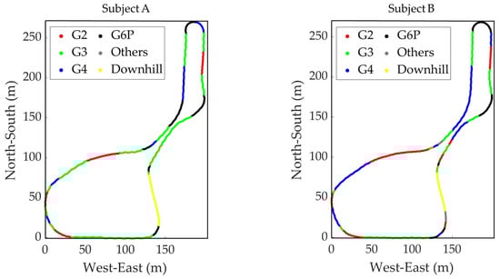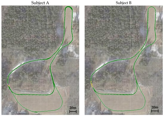 The fix rate of the data obtained from the GNSS device was 99.1% for subject A and 98.6% for subject B (Figure 4).