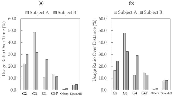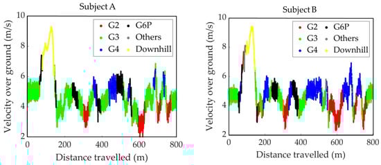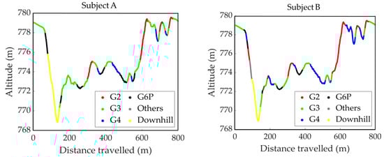 The characteristics of each sub-technique were analyzed using all GNSS solutions. The time required for the timed race was 909 s for subject A and 860 s for subject B. The time percentages for each technique were as follows: G2 was 22.0% and 30.0%, G3 was 48.7% and 31.6%, G4 was 10.9% and 25.8%, G6P was 13.5% and 11.4%, “others” was 0.5% and 1.3%, and downhill was 4.4% and 4.7% (Figure 5a). The distance percentages for each technique were as follows: G2 was 16.5% and 24.5%, G3 was 48.1% and 32.4%, G4 was 12.6% and 29.0%, G6P was 14.5% and 12.6%, “others” was 0.6% and 1.5%, and downhill was 7.7% and 8.2% (Figure 5b).
