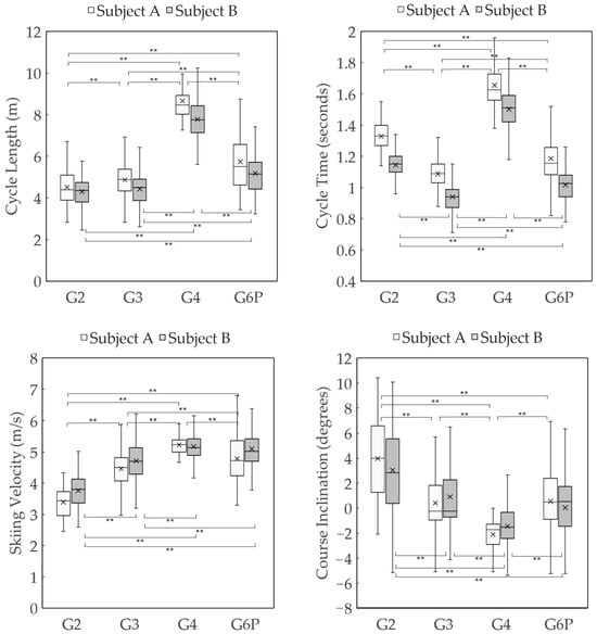 This figure shows the CL, CT, skiing velocity, and course inclination data for subjects A and B’s sub-techniques during the timed race. Each sub-technique cycle was defined from the vertical movement peak at the waveform data’s head to the next peak. The horizontal line within each box represents the median value of the dataset, while the “x” symbol denotes the mean value. ** indicates a significance level of p < 0.01.