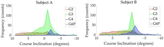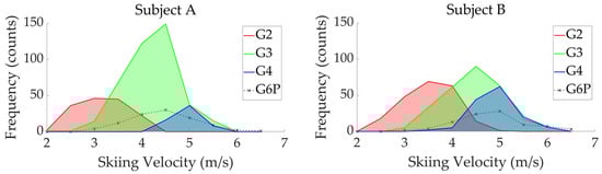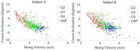 The distribution of four sub-techniques used by two subjects during the timed race is shown in Figure 10, Figure 11 and Figure 12. Figure 10 shows the sub-technique distribution plotted against skiing velocity (X-axis) and course inclination (Y-axis). Figure 11 and Figure 12 show the frequency distribution of sub-techniques as histograms for skiing velocity (Figure 11) and course inclination (Figure 12), respectively. Each sub-technique was classified and described based on GNSS data from the skier’s head.