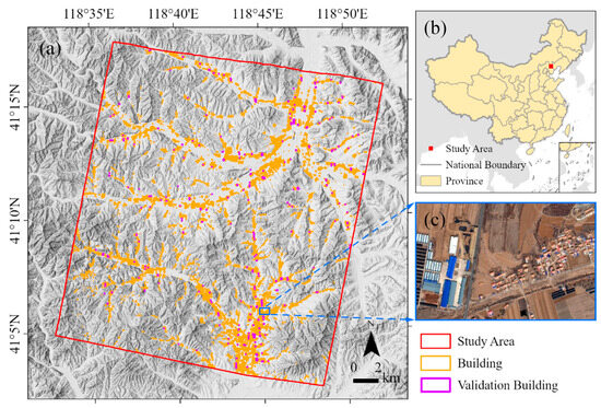 The study area is located in Pingquan, Hebei Province, China (Figure 1b). It has an area of 562 km2 and elevations ranging from 520 m to 1181 m above sea level (Figure 1a), with longitude ranging from 118°32′43″ E to 118°52′20″ E and latitude ranging from 41°2′27″ N to 41°17′49″ N. The main land cover types in the study area are forest, shrub, farmland, buildings, and water. The main building types are bungalow, workshop, multistory, and greenhouse (Figure 1c). The diversity of topography and industry makes the study area a representative sample of rural areas. In the northwestern part of the study area, there are villages in the mountains where the predominant building style is the bungalow. The northeastern part of the study area, which is a relatively flat and open area where the rivers meet, is much more densely populated, with a large number of greenhouses and workshops. The southeastern part of the study area is close to the center of Pingquan City and has more large factories and office buildings.