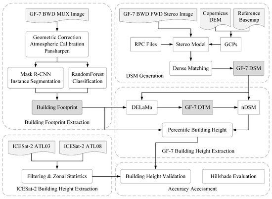 - Wang, J.; Hu, X.; Meng, Q.; Zhang, L.; Wang, C.; Liu, X.; Zhao, M. Developing a Method to Extract Building 3D Information from GF-7 Data. Remote Sens. 2021, 13, 4532. [Google Scholar] [CrossRef]