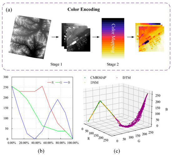 The color encoding module: (a) two-stage color encoding; (b) RGB components of CMRMAP; (c) CMRMAP, digital surface model (DSM), and digital terrain model (DTM) in RGB color space.