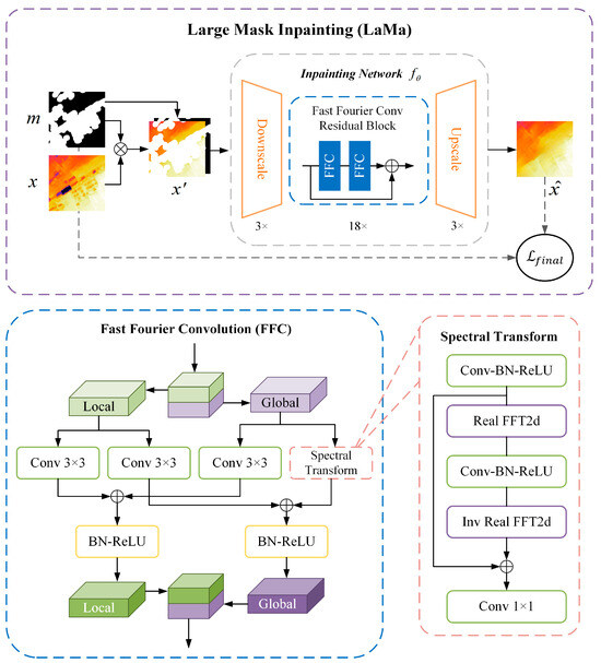 In Figure 4, denotes building masks obtained by expanding building footprints by 10 m to ensure complete coverage. denotes the color-encoded DSM, denotes a four-channel tensor consisting of the masked image and the mask. The input is processed by the feed-forward inpainting network to yield the three-channel color image . In FFC, the channels are split into two parallel branches. The local branch uses conventional convolutions, whereas the global branch uses real FFTs to account for the global context. The steps are as follows: