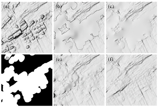 Comparisons of different DSM editing methods. The results are presented as multidirectional hillshade to show details: (a) original GF-7 DSM; (d) building mask, derived from the building footprints; (b) filled in using Copernicus DEM; (c) plane fitting; (e) terrain filter; and (f) our method, DELaMa.