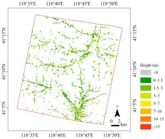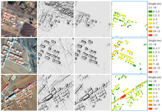 The building height map of the entire study area is shown in Figure 6. The result is aggregated to a 50 m ground sampling distance (GSD) for visualization. In general, the taller buildings are mainly found in the flat, open area to the south of the study area, which is a town center with many workshops and multistory buildings. In the southwestern valley, there are some buildings over 15 m high, which are large production facilities around a mine. In another town center to the north, several school buildings and workshops are over 15 m high. Most buildings in remote valleys are between 3 and 5 m. The shortest buildings are the greenhouses, but some of the greenhouses are underestimated, as they are close to 0 m. Figure 7 shows examples of building height extraction. The first column is the GF-7 multispectral image, the second column is the GF-7 DSM, the third column is the nDSM, and the fourth column is the extracted building height. It can be seen that the larger buildings are usually taller, the bungalows are of a similar height, and the outbuildings are lower.