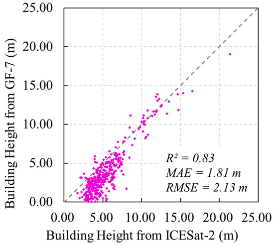 Scatter plot of the building heights from GF-7 against the building heights from ICESat-2.
