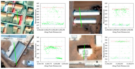 The buildings whose footprints intersect the ICESat-2 beams were employed as the validation buildings. To ensure the reliability of the validation, the following samples were excluded from the validation set: (1) the number of ICESat-2 photons or the nDSM values from successful stereo matching in the building footprint of less than 10 or located only near the edges of the building; (2) buildings obscured by trees; (3) closely surrounded by other buildings, with no ground-reflected ICESat-2 photons in the buffer; and (4) buildings less than 1.5 m in height as measured by ICESat-2. Finally, a total of 383 buildings were used for validation (Figure 1a). The scatter plot of the building heights from GF-7 against the building heights from ICESat-2 is shown in Figure 8, with an R2 of 0.83, an MAE of 1.81 m, and an RMSE of 2.13 m. Figure 9 and Appendix A show the quality control and inspection of the validation process, demonstrating the reliability and robustness of the ICESat-2 building height extraction method. The ICESat-2 photons are shown as green dots. The 90th percentile values of photon elevation in building footprints and the 10th percentile values of photon elevation in buffers are marked with red and blue dashed lines, respectively.