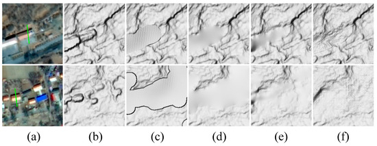 Figure 5 shows comparisons of DELaMa with three other commonly used DSM editing methods using the same mask (Figure 5d) as the processing area. To show details, they are presented as multidirectional hillshade. Figure 5a shows the original GF-7 DSM. Figure 5b shows the result filled in using other DEM sources. Here, we used the Copernicus DEM, which was interpolated to a resolution of 0.5 m. The result reflects some topographic relief information. It has a smooth surface and obvious errors at the edges. Figure 5c shows the result of the plane fitting. The entire processed area is flat and smooth. Figure 5e shows the result of the terrain filter, which smoothed out the protrusions of buildings while preserving certain terrain details. Figure 5f shows the result of DELaMa. Compared with the other three methods, our method not only preserved the most topographic details but also generated a reasonable prediction of the topographic details inside the mask based on the topographic features of the entire area.