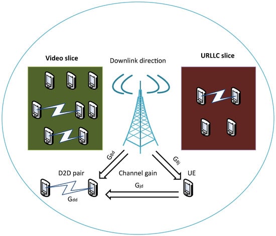Table 1. This section discusses the state and action spaces and the reward function for the proposed scenario. We considered that a single BS provides the radio resource for network slices running different services (i.e., URLLC and video). D2D communication occurs in each slice of the network, as shown in