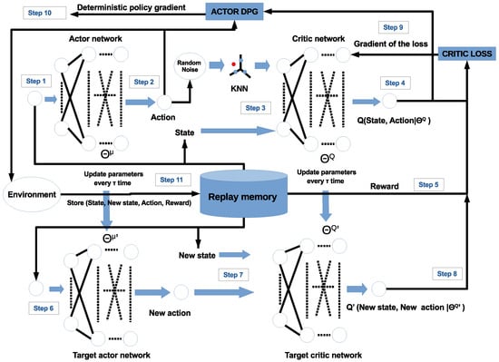 21], the DDPG was proposed by integrating DQN and the actor–critic method to solve problems with a continuous, high-dimensional action space. DDPG is one of the agents that perform policy learning using the gradient of the objective function (
