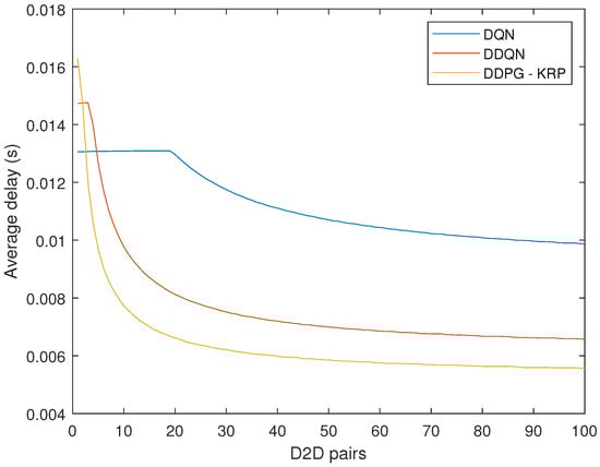 In terms of computational overhead, the DDPG algorithm has a better training performance because the action generated at the output of its actor neural network is related to only one neuron, while the other methods have one neuron at the output of their neural network for each possible combination of actions, which in our scenario amounts to approximately 500,000 combinations. Therefore, our proposed approach that uses the KNN algorithm improves the performance of the DDPG-KRP algorithm as well as the efficiency of the DDPG considering large networks. Several recent works have attempted to solve the problem of some RL approaches presenting a large discrete action space by discretizing the continuous action space [