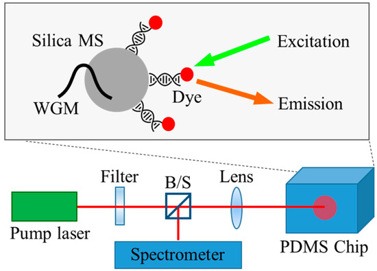 Silica microspheres support the internal WGM and the interaction of the outer evanescent field with the DNA/dye attached to their surface, providing feedback for laser oscillation. The microspheres are injected into a fluidic channel fabricated on a PDMS chip. The optical pump and laser oscillation measurements are performed simultaneously through a confocal setup.