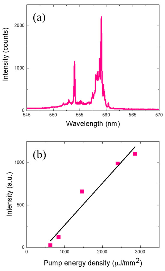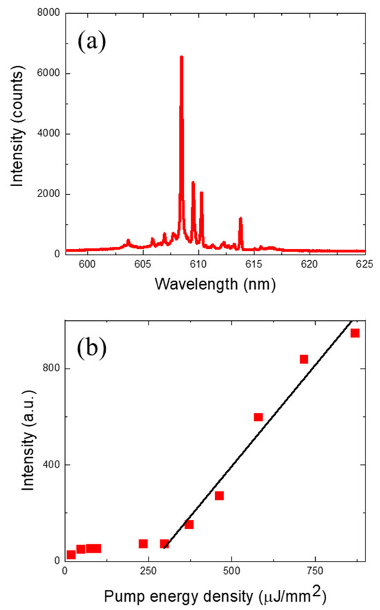 (a) Laser emission spectra from DNA microspheres stained with intercalating dyes without labeling. It was optically pumped with an energy density of 2.4 mJ/mm2. (b) Laser emission intensity at varying pump energy density. The laser threshold was approximately 500 µJ/mm2.