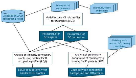 This is summarized in Figure 1, with white boxes for the RQs and associated activities, while the input information is shown in light blue, and the results have a dark blue background. The first goal is the modeling of the qualification of ICT roles required by SC projects (RQ1) using the results of the SMACITE survey, developed (see [17]) with the reference of the literature, reports, and cases and expressed with items of ESCO. The two profiles served as basis for the following: