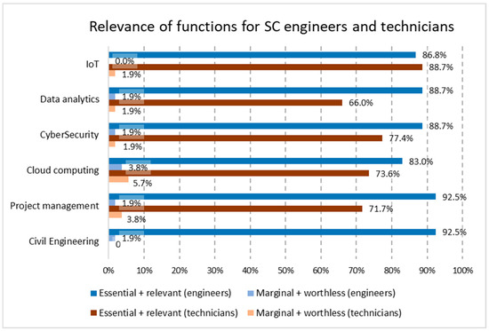 The proposed functions for the SC engineer and the SC technician were extended to cover all of the identified aspects for SC projects, and not only IoT projects, meaning that new areas appear, especially for engineers; in addition, cloud computing, civil/construction engineering (for engineers), and project management completed the profile for SC engineers and technicians. The results from the survey show the relevance of the functions and responsibilities allocated by participants for the determination of the recommended profile of SC engineers and SC technicians (see Figure 2), grouping the percentage of those declaring essential or relevant importance and that of those opting for a value of marginal or worthless importance.