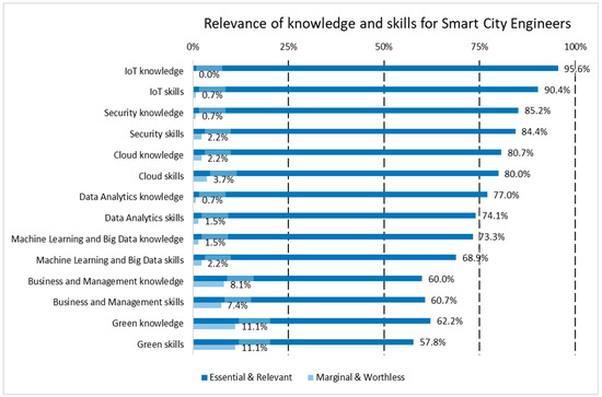 A more detailed analysis was conducted by including 89 specific knowledge and skill items identified in ESCO within the survey. Overall, knowledge tends to be valued more highly than skills for engineers compared to technicians. Non-technical areas, such as business management and environmental sustainability, are perceived as largely irrelevant for technicians, according to the survey respondents, in comparison to engineers. When focusing on SC technicians, new areas such as management and green knowledge and skills received less support, with only 33–37% of experts deeming business-related knowledge and skills essential or relevant, and 43–47% doing so for green knowledge and skills, respectively. Among those surveyed, at least 57.8% highlighted all of the proposed sets of knowledge and skills, including sustainability aspects for the twin transition, as essential or relevant for engineers. The findings reveal that technical knowledge and skills in areas such as IoT, cybersecurity, cloud computing, and data analytics are more widely accepted, with over 74% of respondents considering them essential or relevant for engineers. For Smart City technicians, the alignment between the required knowledge and skills and the necessary functions is evident, with IoT, cybersecurity, and cloud computing being identified as areas more needed in these profiles. The domain of machine learning and big data, encompassing both skills and knowledge, ranks as the least relevant. While approximately 70% of the respondents consider it important for engineers, only around 50% view it as significant for technicians, indicating that this area is not a key factor in the qualification profile of SC technicians.