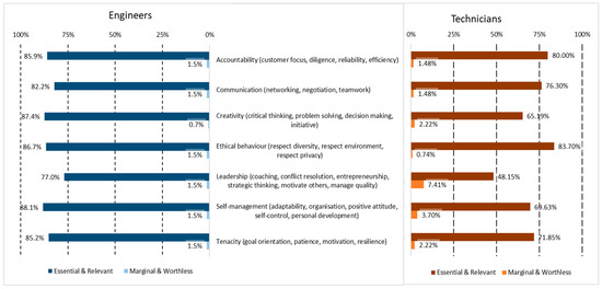 In the case of soft skills, they were already analyzed in [17], taking the model of the Skills Match project [33,34] as a reference. The extended version of the results did not generate relevant changes in the relevance of the groups of soft skills for SC engineers, where most of the differences are below 0.5%, with highest of 0.8% in communication. However, the technicians show bigger differences, with differences close to 10% (e.g., in creativity). The final soft skills profile for both occupations is shown in Figure 5. The main difference between the engineers and the technicians is in the case of leadership, which is relevant for engineers (76.8%), while it is not for technicians (49.3%, below the threshold of 50%). Other soft skills are at a higher level of relevance in engineers, although they are considered as relatively relevant in technicians, such as creativity (88% vs. 55.6%), self-management (88% vs. 69%), and tenacity (85.2% vs. 71.8%).