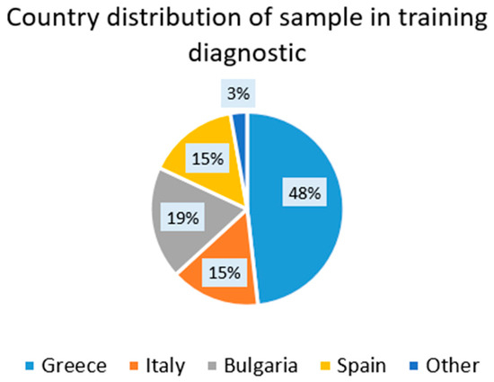The results of the 256 preliminary assessments from a sample of candidates for the SC engineer and technician modules could provide some insights into the presence of skills and knowledge on the SC areas in interested professionals prior to the exposure to training processes. This could provide an orientation on the degree of familiarity of people with the relevant concepts of the qualification for SC projects in the following six areas: Smart Cities foundations, cloud computing, IoT, cybersecurity, and data analytics (and machine learning for SC engineers). The type of diagnostic assessment in each module is different for the case of the training program for the SC engineer and for the SC technician. The sample of candidates had a varied set of educational backgrounds (see Table 8) with a varied geographical distribution (Figure 6), while the gender distribution was unbalanced (72% of male vs. 28% of female).