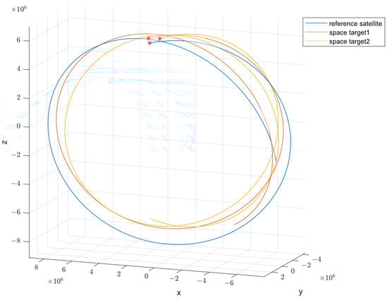 According to the spatial target motion model, the motion trajectories of the infrared satellite and the spatial targets are plotted as shown in Figure 1.
