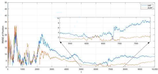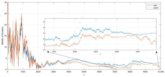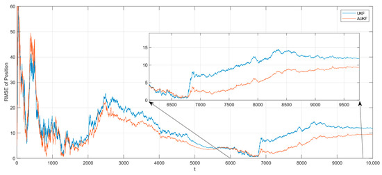 In the case where the measurement noise is Gaussian white noise with a step change in covariance, the tracking RMSE of the spatial target 2 is shown in Figure 8. The partial magnification of the position RMSE is shown in Figure 9.