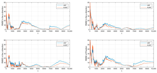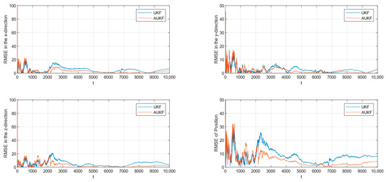 The average RMSE for all times in the -direction is calculated as in Equation (60) and, similarly, the average RMSE can be calculated in the -direction and -direction, as well as in the overall position: