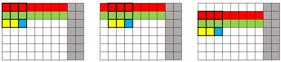 Representation of the application of the convolution mask in 3 situations (in red is represented “Buffer_1”, in green “Buffer_2”, in yellow “Buffer_3”, the current pixel in blue and the two columns that are not processed in gray).