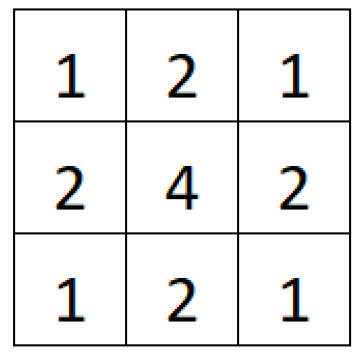 Another noise reduction filter is the Gaussian filter. The method can be explained in three steps: first of all, each position of the convolution mask (Figure 4) is multiplied by the corresponding pixel values in the image; then, all nine results are summed, and finally, the final value is divided by 16.