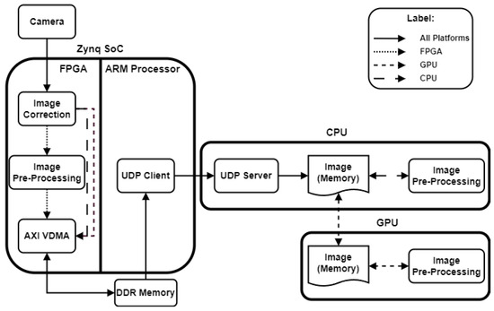 Three architectures have been developed, each executing the pre-processing block on one of the platforms mentioned above. Figure 5 illustrates the placement of each pre-processing module within the respective architectures. To clarify the execution responsibility of each platform, four distinct line styles are used: solid lines represent blocks executed by all platforms, dotted lines indicate FPGA modules, short dashed lines denote GPU blocks, and long dashed lines correspond to CPU blocks.