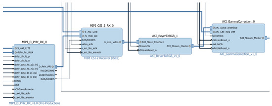 The hardware part of the demo can be divided into four sections: image acquisition, gamma correction, connection to the Zynq processing system, and data streaming via HDMI. Image acquisition is handled by two modules that convert the received RAW data to AXI4-Stream buses. The gamma correction stage is characterized by the conversion from of RAW RGB to RGB pixels with 24 bits each (values ranging from 0 to 255 per component) as well as the application of a gamma correction factor (1/1.8) that influences the input data brightness (Figure 6). The connection with the Zynq processing system is made by a VDMA IP that has two main functions: to store three Full HD frames (1920 × 1080p) on a DDR memory to be accessed by the Zynq processing system (circular buffer) and to transmit the AXI4-Stream bus to the HDMI section (Figure 7). The last stage is responsible for streaming the data out through HDMI; this process is performed by four modules that generate HDMI control signals, synchronize, and stream the output value (RGB pixel).