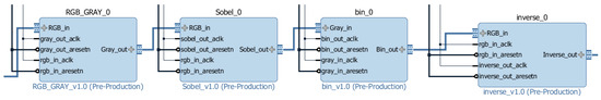 To identify the defects, a sequence of filters was developed to highlight and detect edges. The filters used in sequence were RGB/Gray, Sobel, Binary, and Inverse, as presented in Figure 11. The first one, which receives data from the AXI gamma correction module, converts an image with three channels into a single channel. The second filter highlights the edges in the grayscale images. The following module converts the grayscale image to black and white (where edges are highlighted in white). Finally, to obtain black edges, the inverse filter was used. The output of the inverse filter is connected to the AXI VDMA module. It is important to note that to implement this sequence, it was required to reduce the clock frequency from 150 to 100 MHz to ensure the required signal propagation delays.